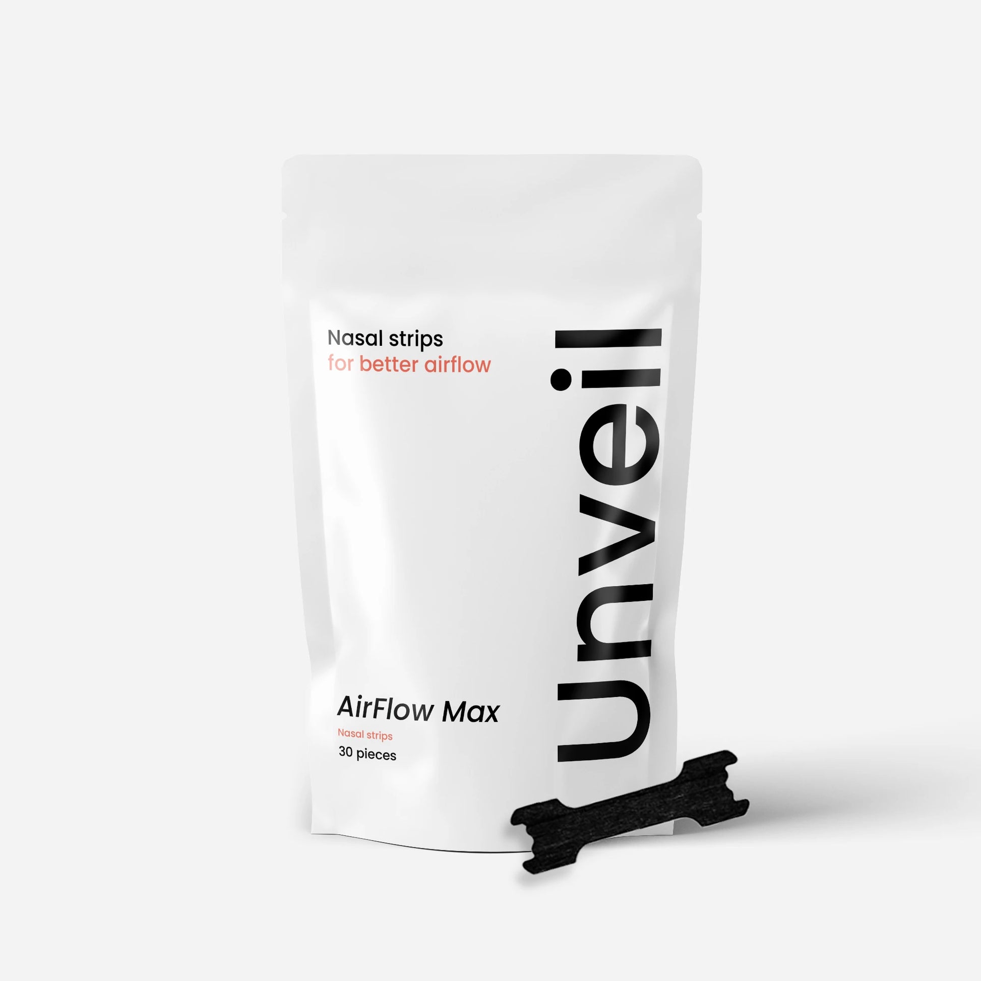 Designed to enhance your breathing and support better performance, Unveil's Performance Max Nasal Strips open your airways for easier airflow and improved oxygen intake. Perfect for athletes, professionals, and anyone seeking better sleep, these strips help reduce congestion, boost endurance, and promote faster recovery – helping you breathe easier and perform at your best every day.